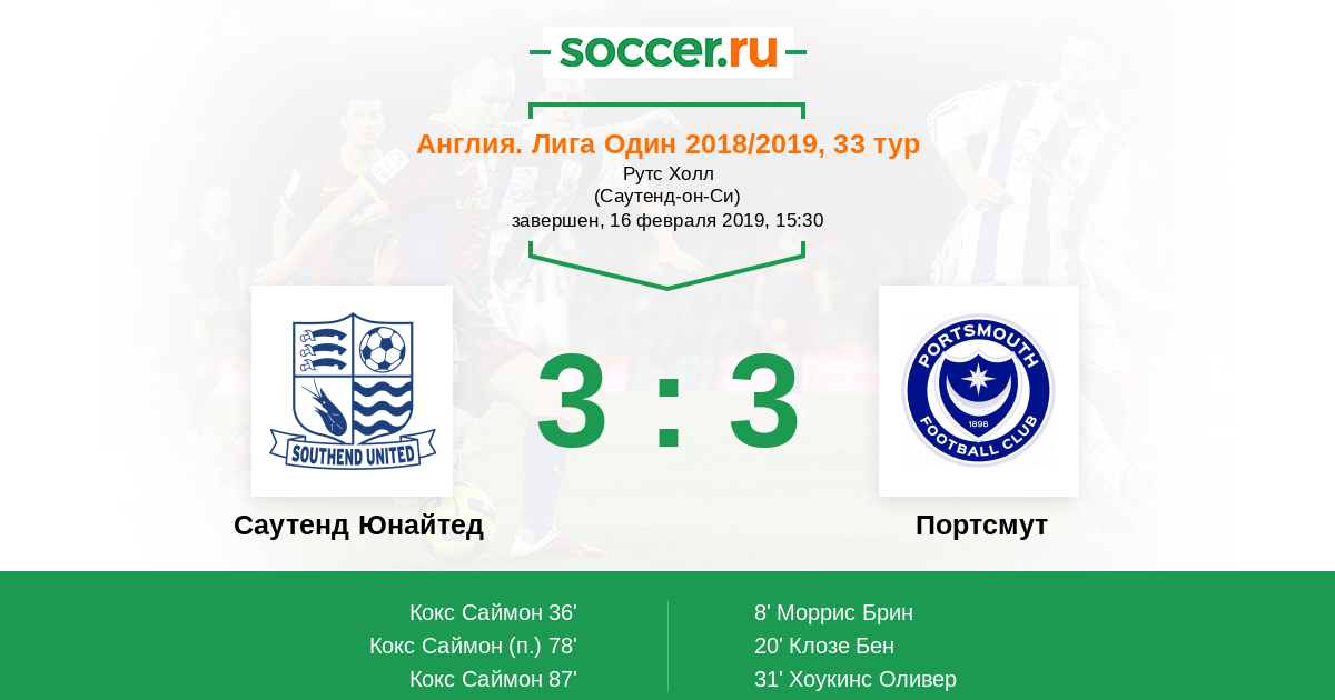 Англия. Первая Футбольная Лига 17.02.2018 Саутенд Юнайтед Логотип футбольный клуб Саутенд Юнайтед (Саутенд-он-Си) 3:1 Логотип футбольный клуб Портсмут Портсмут