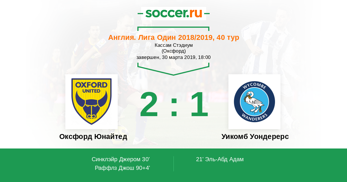 Англия. Вторая Футбольная Лига 06.04.2013 Оксфорд Юнайтед Логотип футбольный клуб Оксфорд Юнайтед 0:1 Логотип футбольный клуб Уикомб Уондерерс (Хай-Вайкомб) Уикомб Уондерерс