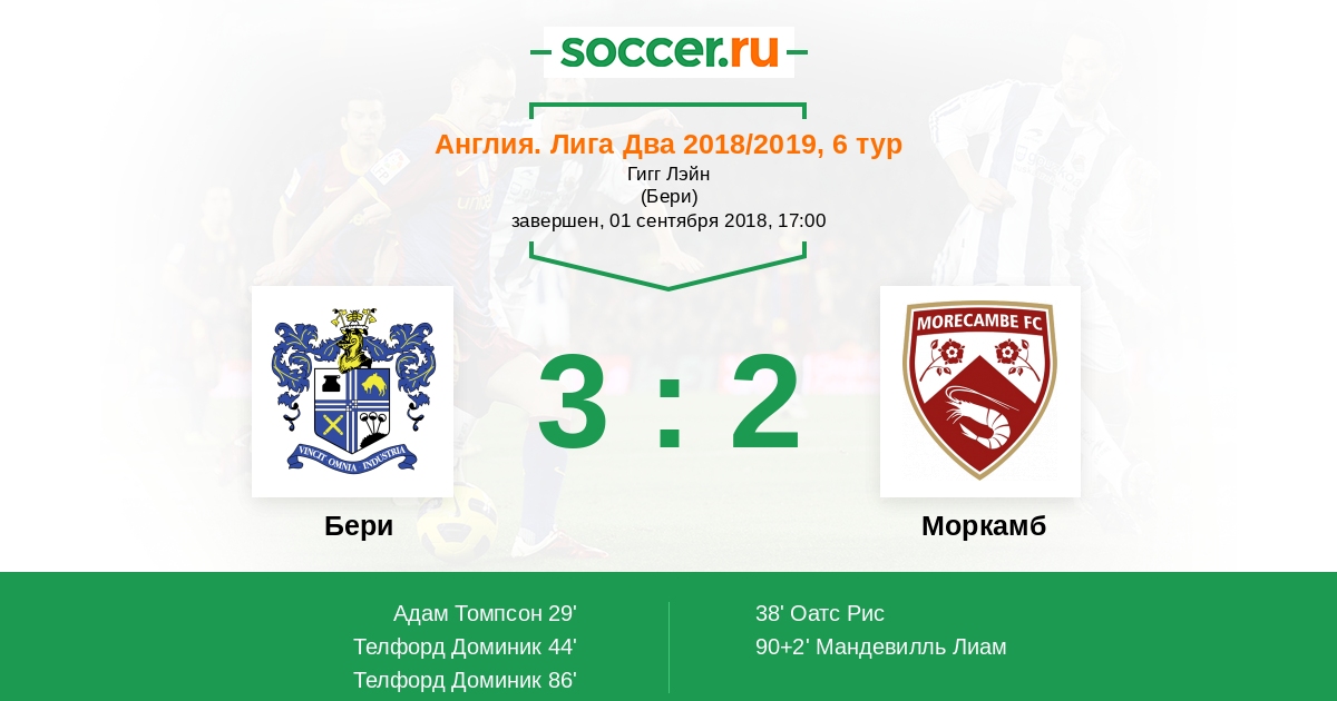 Англия. Вторая Футбольная Лига 09.02.2019 Моркамб Логотип футбольный клуб Моркамб 2:3 Логотип футбольный клуб Бери Бери