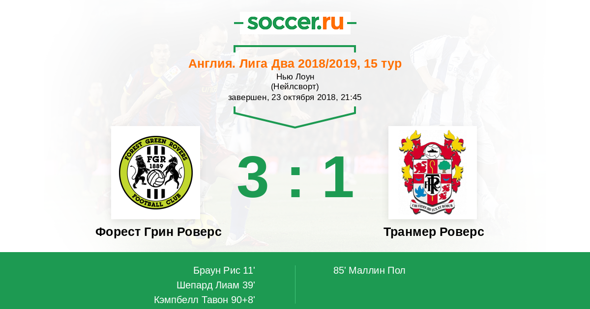 Англия. Вторая Футбольная Лига 19.04.2019 Транмер Роверс Логотип футбольный клуб Транмер Роверс 0:1 Логотип футбольный клуб Форест Грин Роверс (Нейлсворт) Форест Грин Роверс