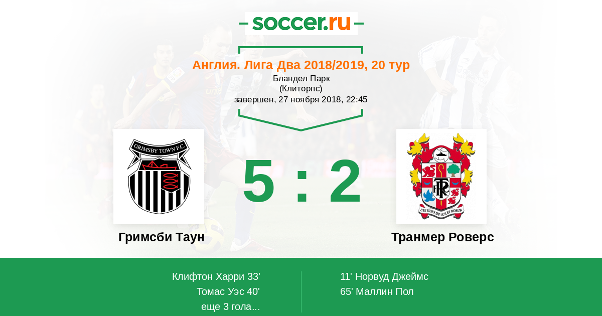 Англия. Вторая Футбольная Лига 12.03.2019 Транмер Роверс Логотип футбольный клуб Транмер Роверс 4:1 Логотип футбольный клуб Гримсби Таун (Клифорпс) Гримсби Таун