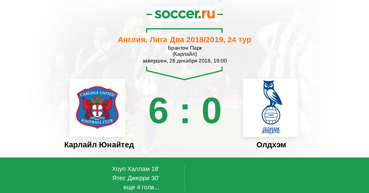 Англия. Вторая Футбольная Лига 06.10.2018 Олдхэм Логотип футбольный клуб Олдхэм 1:3 Логотип футбольный клуб Карлайл Юнайтед (Карлайсл) Карлайл Юнайтед