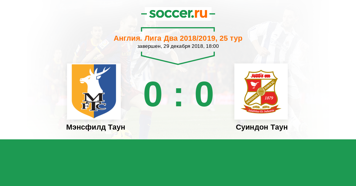 Англия. Вторая Футбольная Лига 20.10.2018 Суиндон Таун Логотип футбольный клуб Суиндон Таун 0:0 Логотип футбольный клуб Мэнсфилд Таун Мэнсфилд Таун