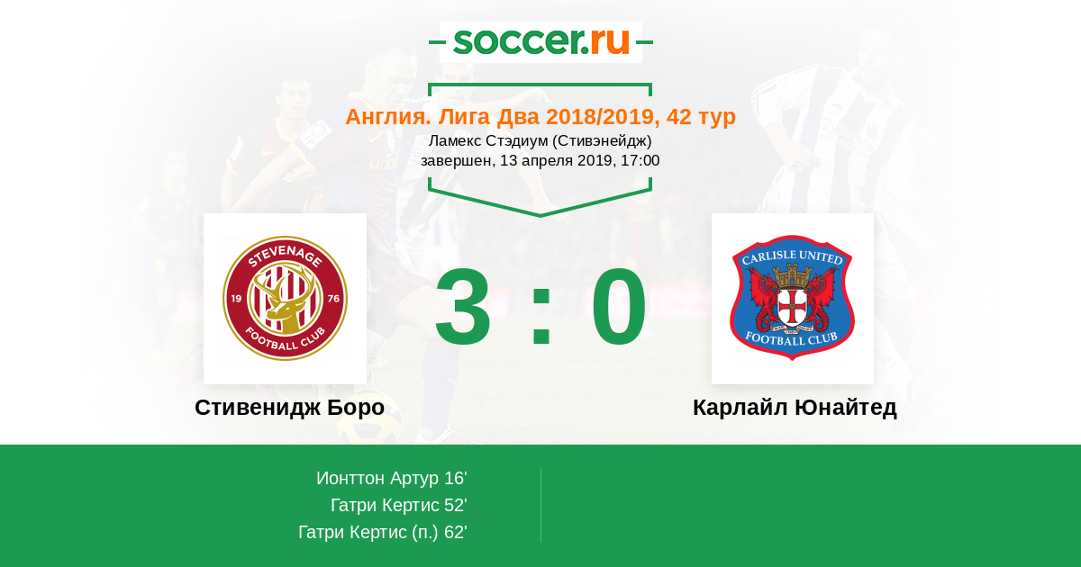 Англия. Вторая Футбольная Лига 17.04.2017 Карлайл Юнайтед Логотип футбольный клуб Карлайл Юнайтед (Карлайсл) 1:1 Логотип футбольный клуб Стивенидж Боро (Стивэнейдж) Стивенидж Боро