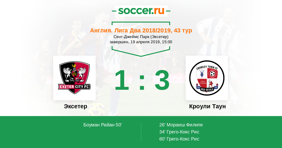 Англия. Вторая Футбольная Лига 21.04.2018 Эксетер Логотип футбольный клуб Эксетер 2:2 Логотип футбольный клуб Кроули Таун Кроули Таун