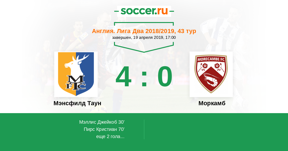 Англия. Вторая Футбольная Лига 25.03.2017 Моркамб Логотип футбольный клуб Моркамб 1:3 Логотип футбольный клуб Мэнсфилд Таун Мэнсфилд Таун