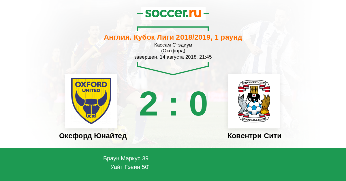 Англия. Первая Футбольная Лига 09.09.2018 Оксфорд Юнайтед Логотип футбольный клуб Оксфорд Юнайтед 1:2 Логотип футбольный клуб Ковентри Сити Ковентри Сити