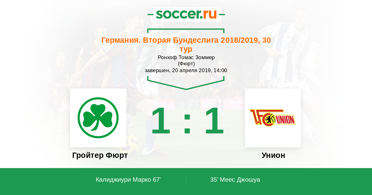 Германия. Бундеслига 29.04.2022 Унион Логотип футбольный клуб Унион (Берлин) 1:1 Логотип футбольный клуб Гройтер Фюрт Гройтер Фюрт