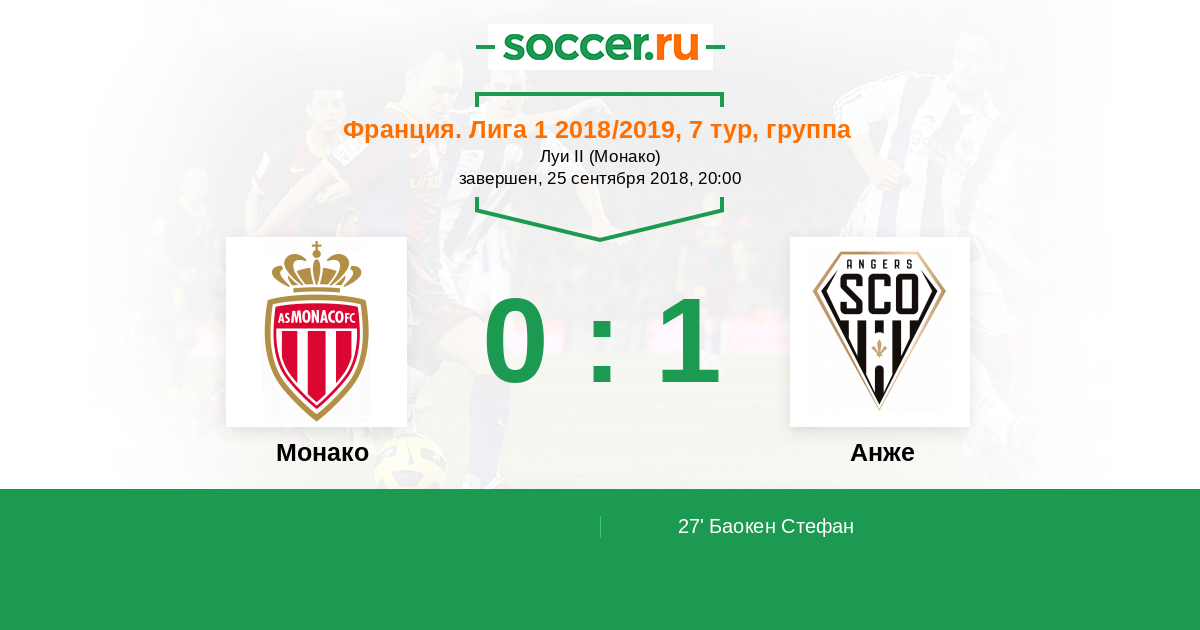 Франция. Лига 1 24.09.2016 Монако Логотип футбольный клуб Монако 2:1 Логотип футбольный клуб Анже Анже