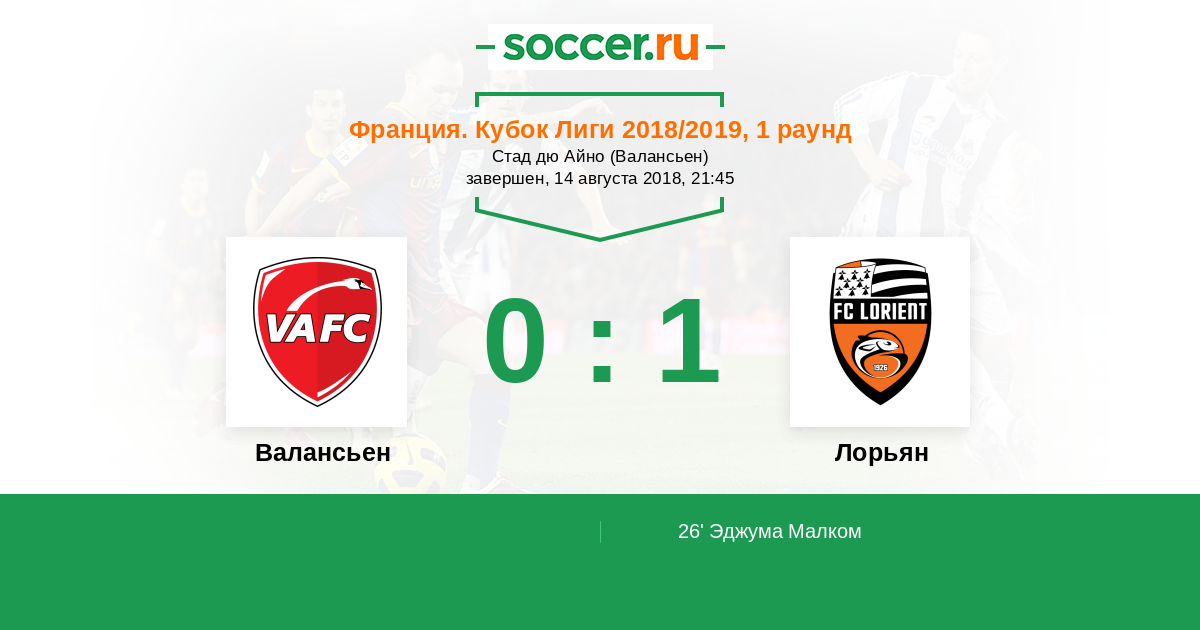 Франция. Лига 2 17.08.2018 Лорьян Логотип футбольный клуб Лорьян 3:1 Логотип футбольный клуб Валансьен Валансьен