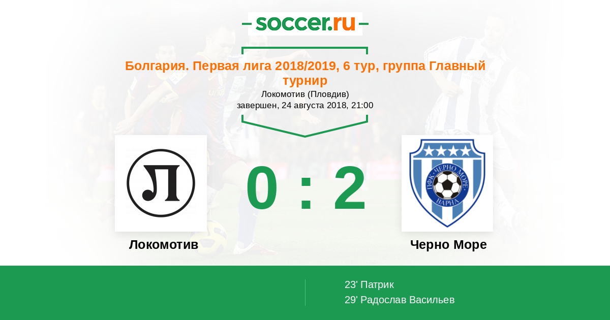 Болгария. Первая лига 19.08.2016 Черно Море Логотип футбольный клуб Черно Море (Варна) 2:0 Логотип футбольный клуб Локомотив (Пловдив) Локомотив