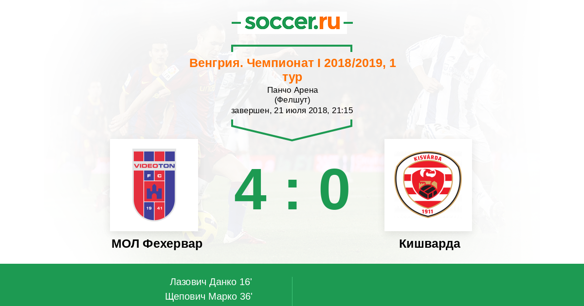 Венгрия. Чемпионат 1 31.08.2019 МОЛ Фехервар Логотип футбольный клуб МОЛ Фехервар (Секешфехервар) 3:0 Логотип футбольный клуб Кишварда Кишварда