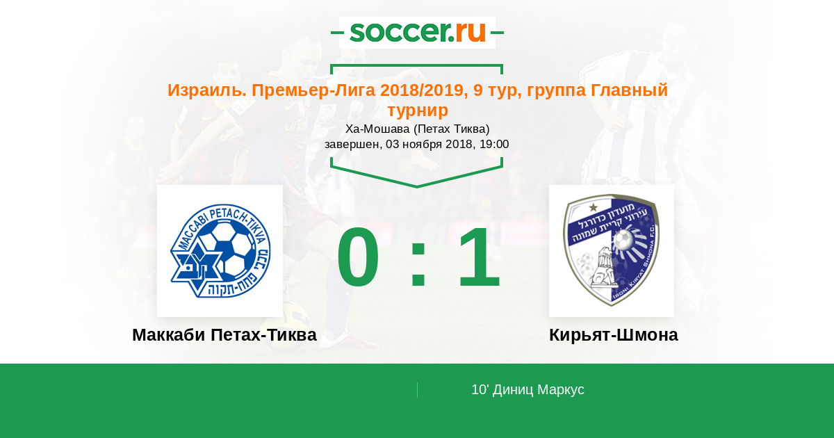 Израиль. Премьер-Лига 30.10.2016 Маккаби Петах-Тиква Логотип футбольный клуб Маккаби Петах-Тиква 2:1 Логотип футбольный клуб Кирьят-Шмона Кирьят-Шмона