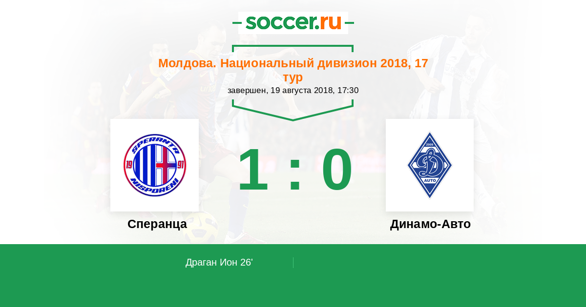 Молдова. Национальный дивизион 19.08.2017 Сперанца Логотип футбольный клуб Сперанца (Крихана Веке) 1:1 Логотип футбольный клуб Динамо-Авто (Тирасполь) Динамо-Авто