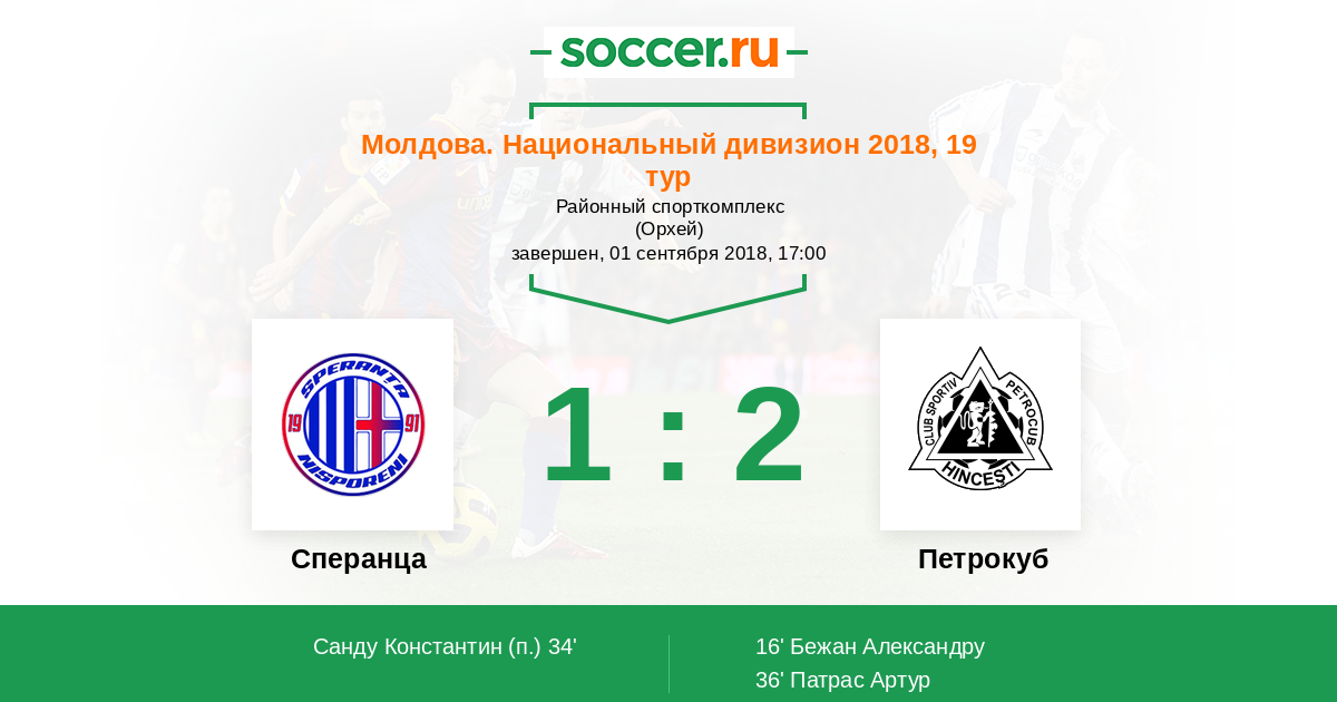 Молдова. Национальный дивизион 16.06.2018 Петрокуб Логотип футбольный клуб Петрокуб (Хынчешты) 1:1 Логотип футбольный клуб Сперанца (Крихана Веке) Сперанца