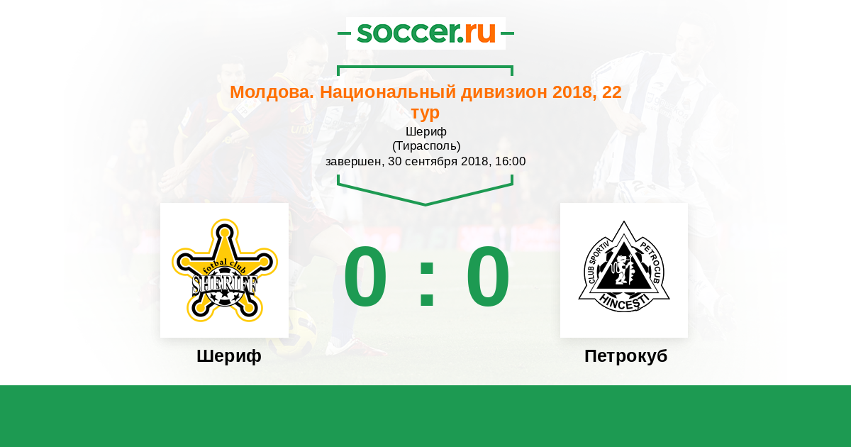 Молдова. Национальный дивизион 01.04.2018 Шериф Логотип футбольный клуб Шериф (Тирасполь) 3:0 Логотип футбольный клуб Петрокуб (Хынчешты) Петрокуб