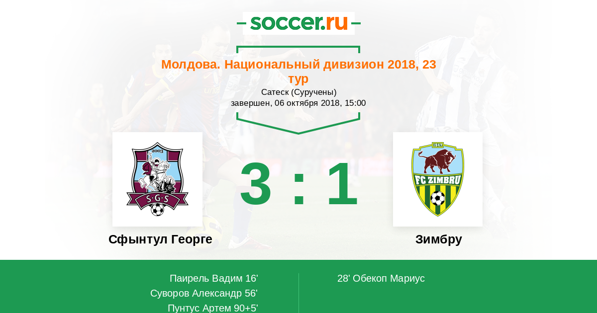 Молдова. Национальный дивизион 23.09.2017 Сфынтул Георге Логотип футбольный клуб Сфынтул Георге (Суручены) 0:0 Логотип футбольный клуб Зимбру (Кишинев) Зимбру