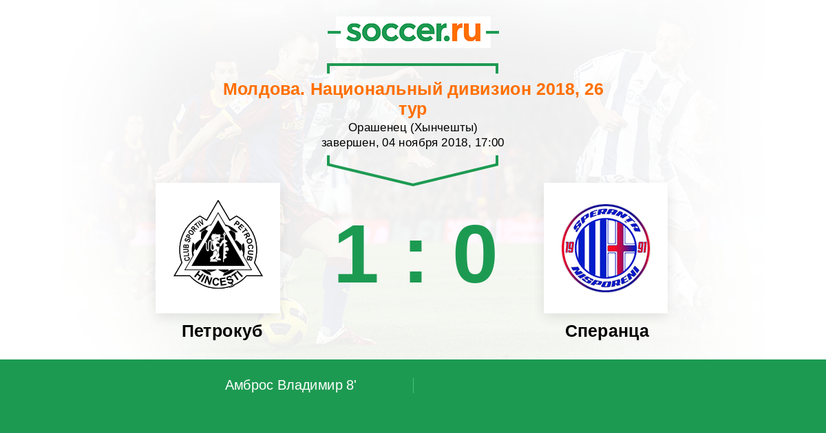 Молдова. Национальный дивизион 29.10.2017 Сперанца Логотип футбольный клуб Сперанца (Крихана Веке) 0:0 Логотип футбольный клуб Петрокуб (Хынчешты) Петрокуб