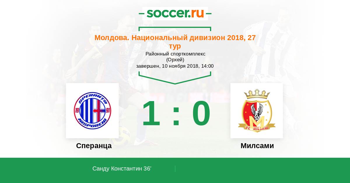 Молдова. Национальный дивизион 05.05.2018 Милсами Логотип футбольный клуб Милсами (Оргеев) 0:1 Логотип футбольный клуб Сперанца (Крихана Веке) Сперанца