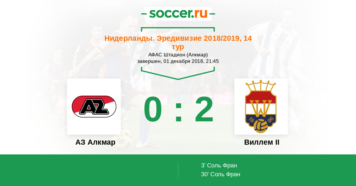 Нидерланды. Эредивизи 23.08.2014 Виллем II Логотип футбольный клуб Виллем II (Тилбург) 3:0 Логотип футбольный клуб АЗ Алкмар АЗ Алкмар