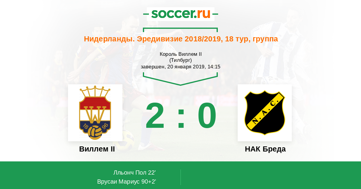 Нидерланды. Эредивизи 21.10.2018 НАК Бреда Логотип футбольный клуб НАК Бреда 2:2 Логотип футбольный клуб Виллем II (Тилбург) Виллем II