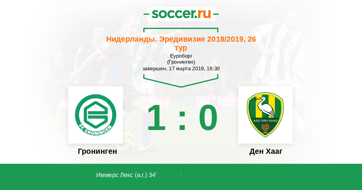 Нидерланды. Эредивизи 11.02.2018 Гронинген Логотип футбольный клуб Гронинген 0:0 Логотип футбольный клуб Ден Хааг (Гаага) Ден Хааг