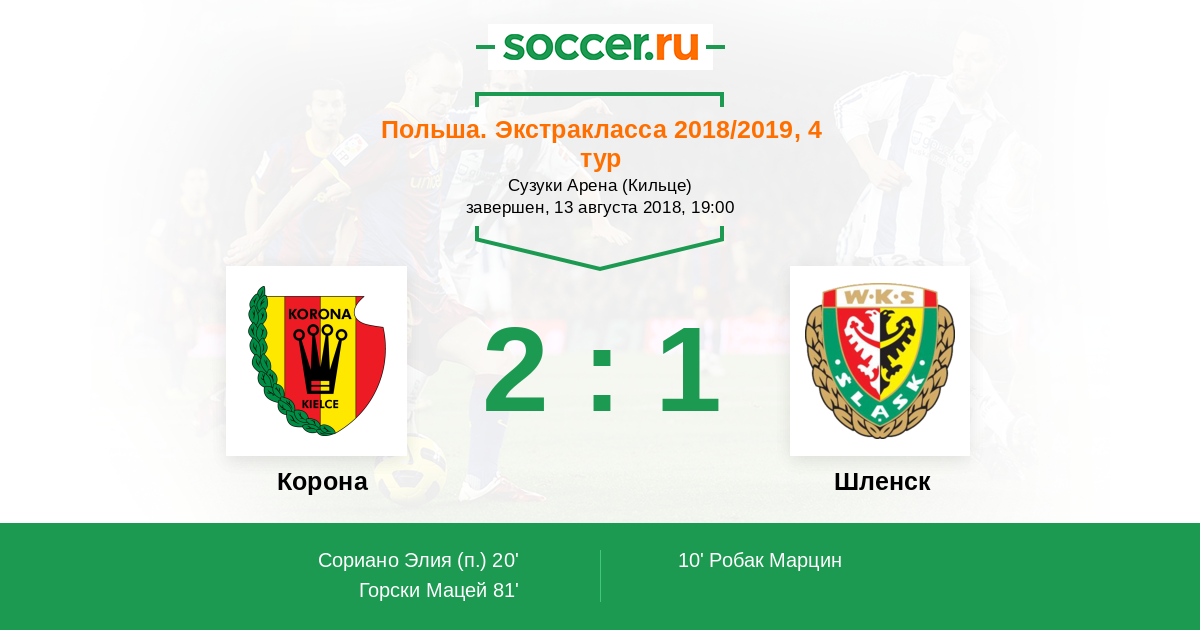 Польша. Экстракласса 27.09.2019 Корона Логотип футбольный клуб Корона (Кельце) 1:0 Логотип футбольный клуб Шленск (Вроцлав) Шленск