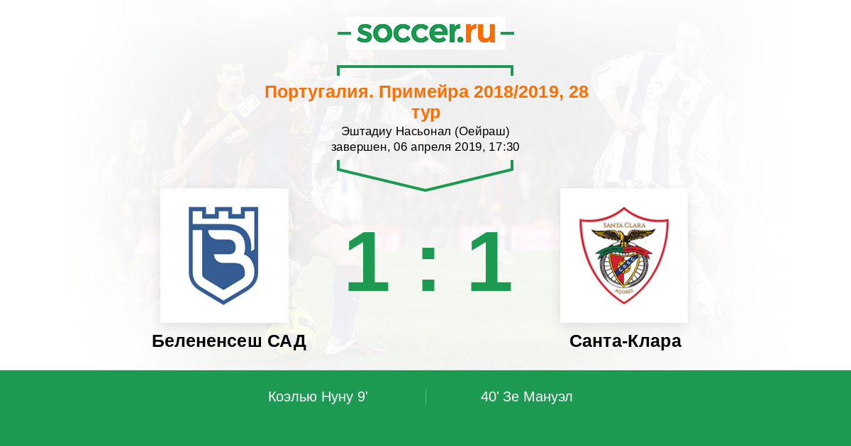 Португалия. Примейра 30.11.2018 Санта-Клара Логотип футбольный клуб Санта-Клара (Понта-Делгада) 2:3 Логотип футбольный клуб Белененсеш САД (Лиссабон) Белененсеш САД