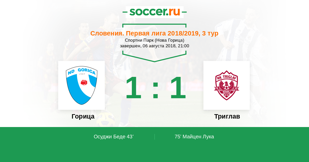 Словения. Первая Лига 19.08.2017 Триглав Логотип футбольный клуб Триглав (Крань) 1:3 Логотип футбольный клуб Горица (Ново-Горица) Горица