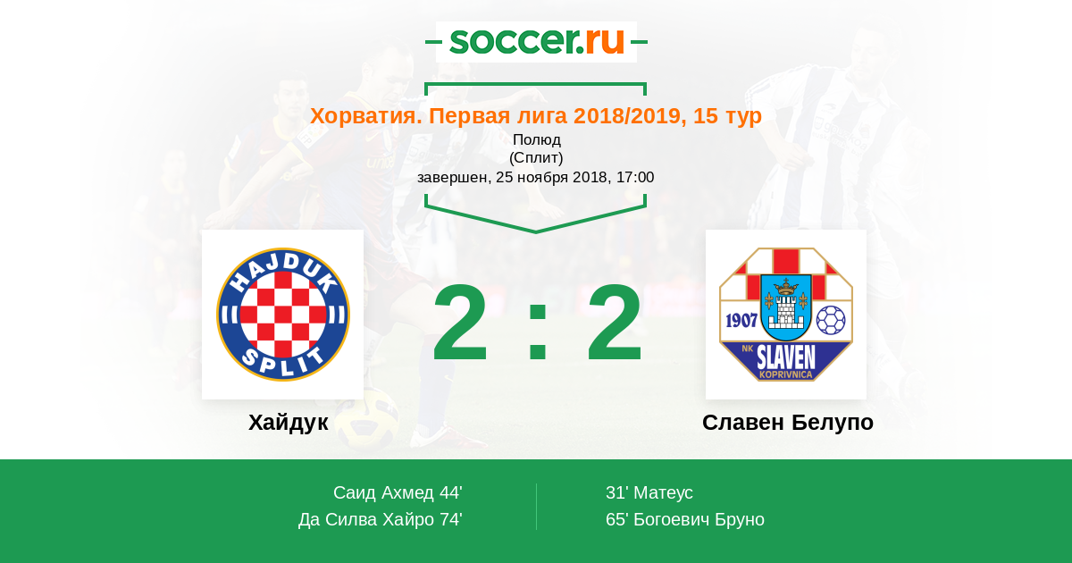 Хорватия. Первая лига 02.08.2015 Хайдук Логотип футбольный клуб Хайдук (Сплит) 2:2 Логотип футбольный клуб Славен Белупо (Копривница) Славен Белупо