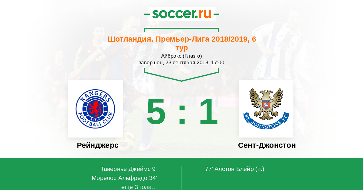 Шотландия. Премьер-Лига 22.09.2019 Сент-Джонстон Логотип футбольный клуб Сент-Джонстон (Перт) 0:4 Логотип футбольный клуб Рейнджерс (Глазго) Рейнджерс
