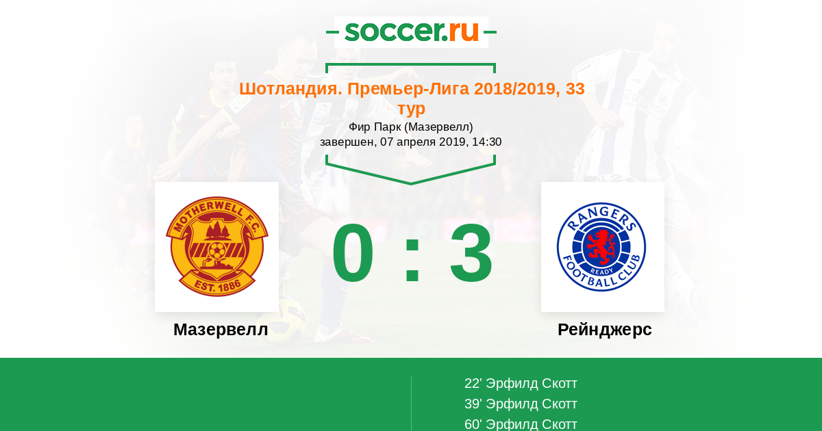 Шотландия. Премьер-Лига 11.11.2018 Рейнджерс Логотип футбольный клуб Рейнджерс (Глазго) 7:1 Логотип футбольный клуб Мазервелл Мазервелл