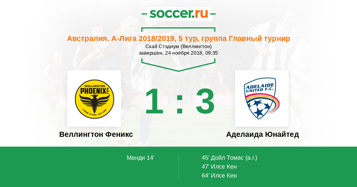 Австралия. А-Лига 30.03.2018 Аделаида Юнайтед Логотип футбольный клуб Аделаида Юнайтед 3:1 Логотип футбольный клуб Веллингтон Феникс Веллингтон Феникс