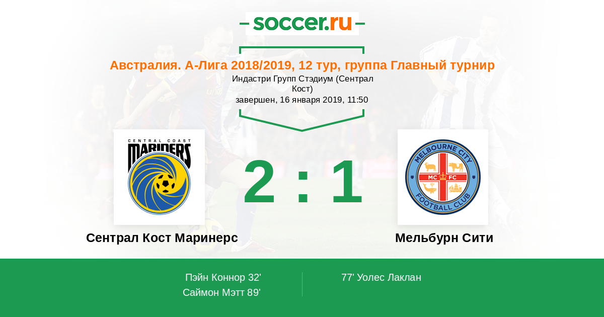 Австралия. А-Лига 19.01.2017 Мельбурн Сити Логотип футбольный клуб Мельбурн Сити 2:1 Логотип футбольный клуб Сентрал Кост Маринерс Сентрал Кост Маринерс