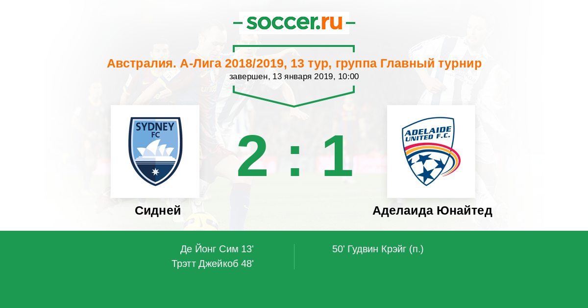 Австралия. А-Лига 16.02.2013 Сидней Логотип футбольный клуб Сидней 2:1 Логотип футбольный клуб Аделаида Юнайтед Аделаида Юнайтед