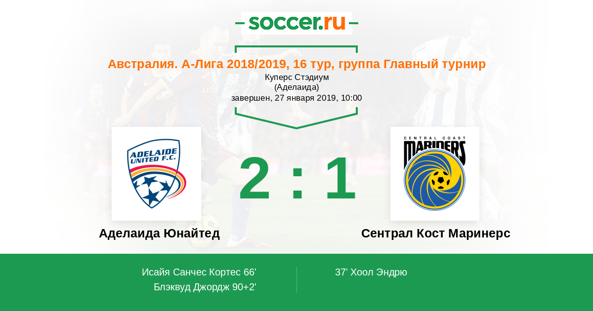 Австралия. А-Лига 16.01.2016 Аделаида Юнайтед Логотип футбольный клуб Аделаида Юнайтед 3:1 Логотип футбольный клуб Сентрал Кост Маринерс Сентрал Кост Маринерс