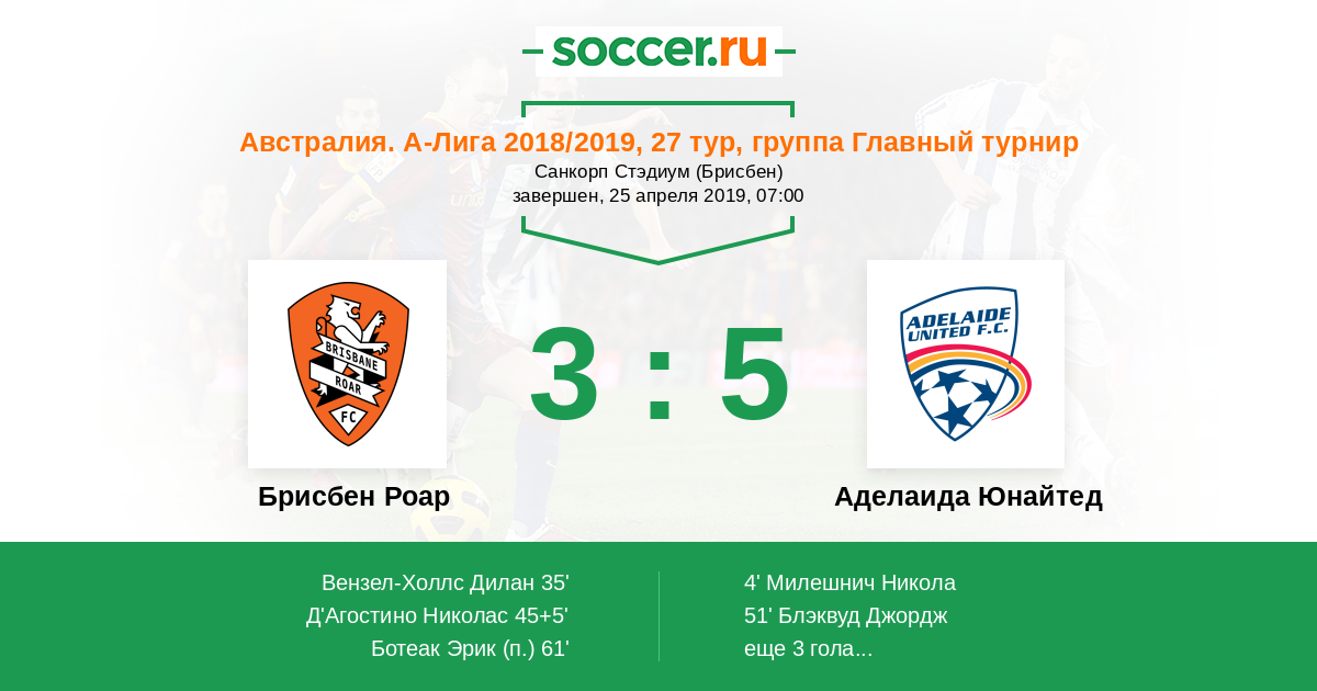 Австралия. А-Лига 11.04.2015 Аделаида Юнайтед Логотип футбольный клуб Аделаида Юнайтед 2:3 Логотип футбольный клуб Брисбен Роар Брисбен Роар