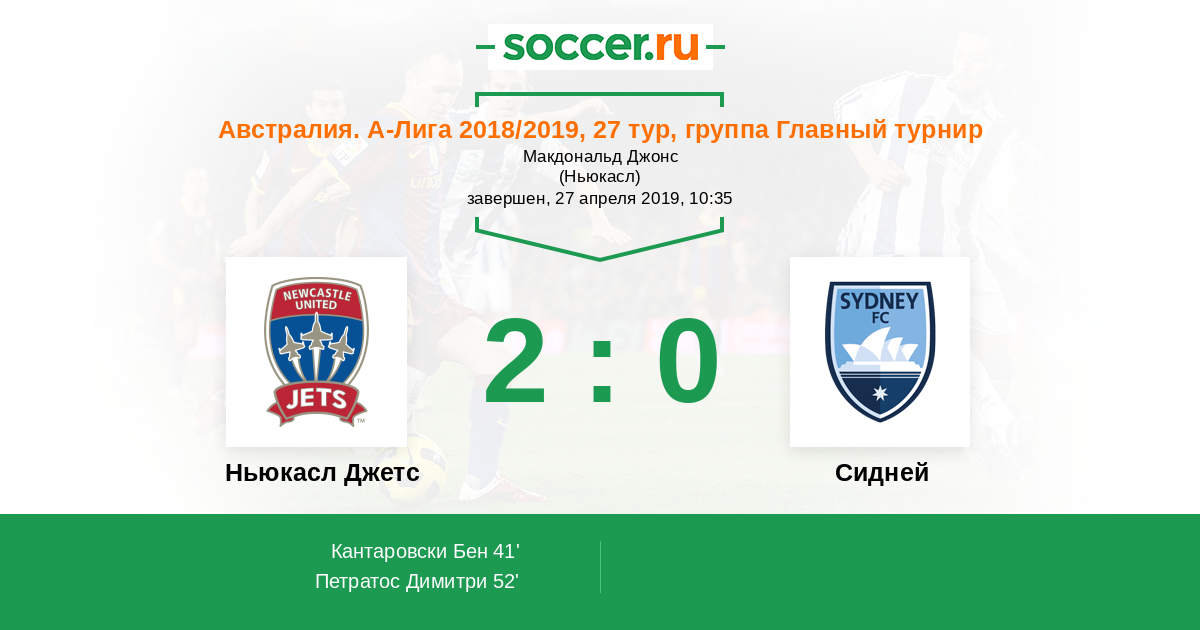Австралия. А-Лига 19.01.2019 Сидней Логотип футбольный клуб Сидней 1:0 Логотип футбольный клуб Ньюкасл Джетс Ньюкасл Джетс