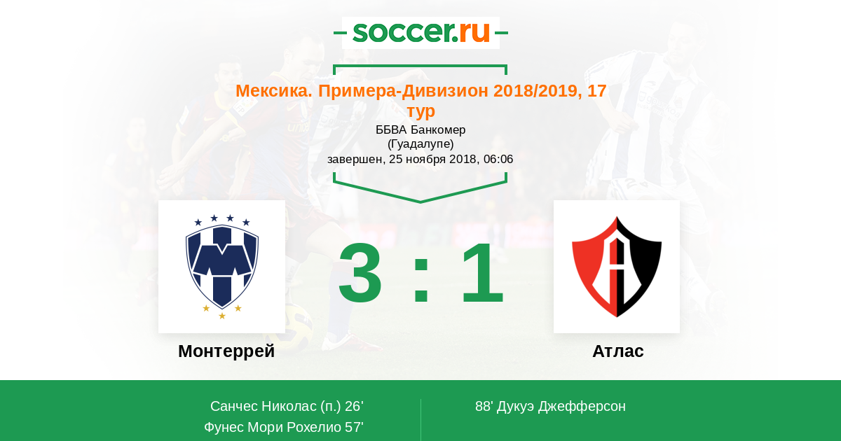 Мексика. Примера-Дивизион 27.11.2017 Монтеррей Логотип футбольный клуб Монтеррей 4:1 Логотип футбольный клуб Атлас (Гвадалахара) Атлас