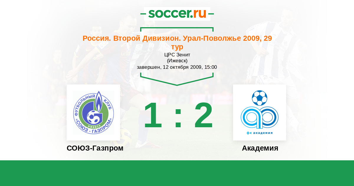 Россия. Вторая лига. Группа 4 04.07.2009 Академия Логотип футбольный клуб Академия (Тольятти) 0:3 Логотип футбольный клуб СОЮЗ-Газпром (Ижевск) СОЮЗ-Газпром