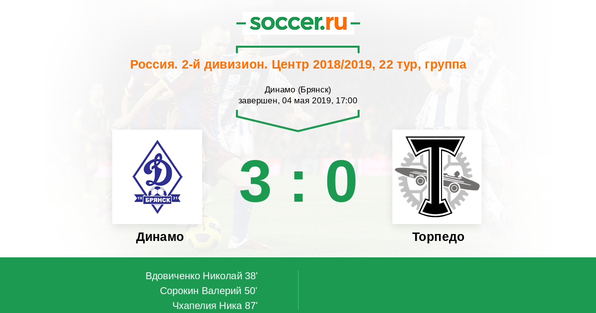 Россия. Вторая лига. Группа 3 22.09.2018 Торпедо Логотип футбольный клуб Торпедо (Москва) 1:0 Логотип футбольный клуб Динамо Брянск Динамо Брянск