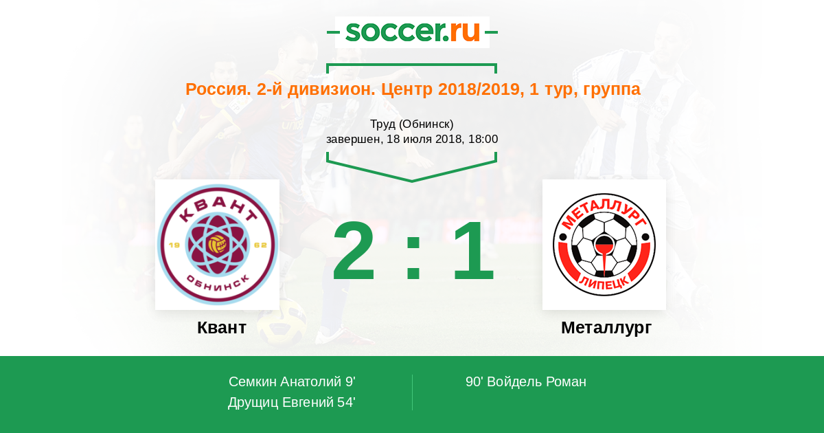 Россия. Вторая лига. Группа 3 16.07.2019 Квант Логотип футбольный клуб Квант (Обнинск) 0:2 Логотип футбольный клуб Металлург (Липецк) Металлург
