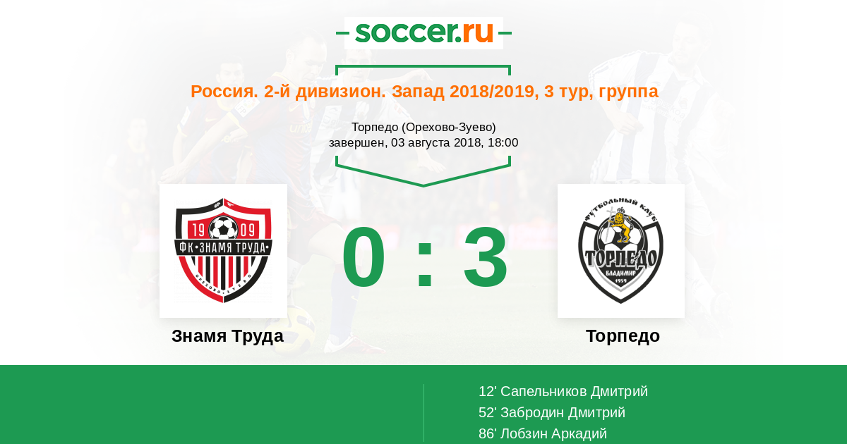 Россия. Вторая лига. Группа 2 18.08.2017 Торпедо Логотип футбольный клуб Торпедо (Владимир) 3:0 Логотип футбольный клуб Знамя Труда (Орехово-Зуево) Знамя Труда