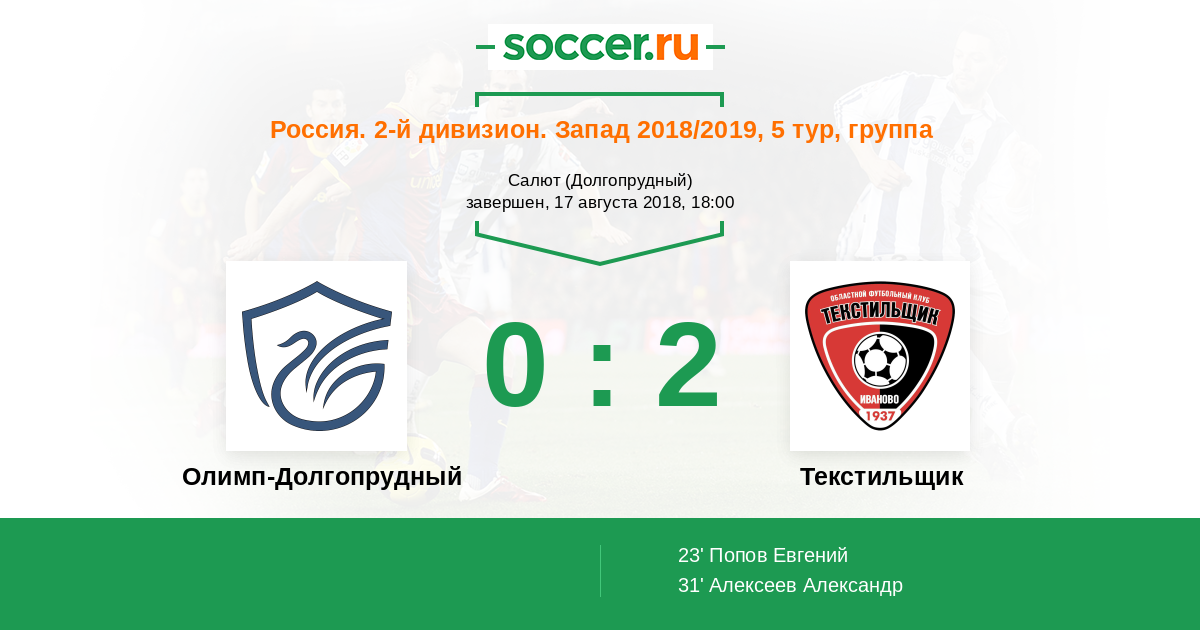 Россия. Вторая лига. Группа 2 01.09.2017 Текстильщик Логотип футбольный клуб Текстильщик (Иваново) 3:3 Логотип футбольный клуб Долгопрудный Долгопрудный