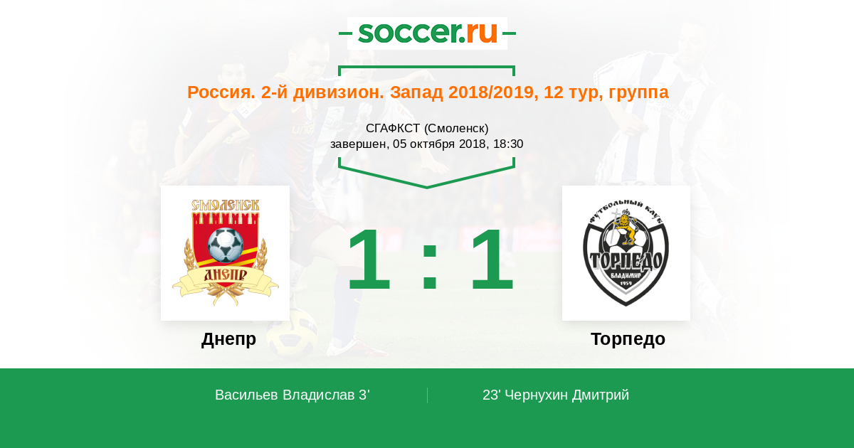 Россия. Вторая лига. Группа 2 17.10.2013 Днепр Логотип футбольный клуб Днепр (Смоленск) 1:1 Логотип футбольный клуб Торпедо (Владимир) Торпедо
