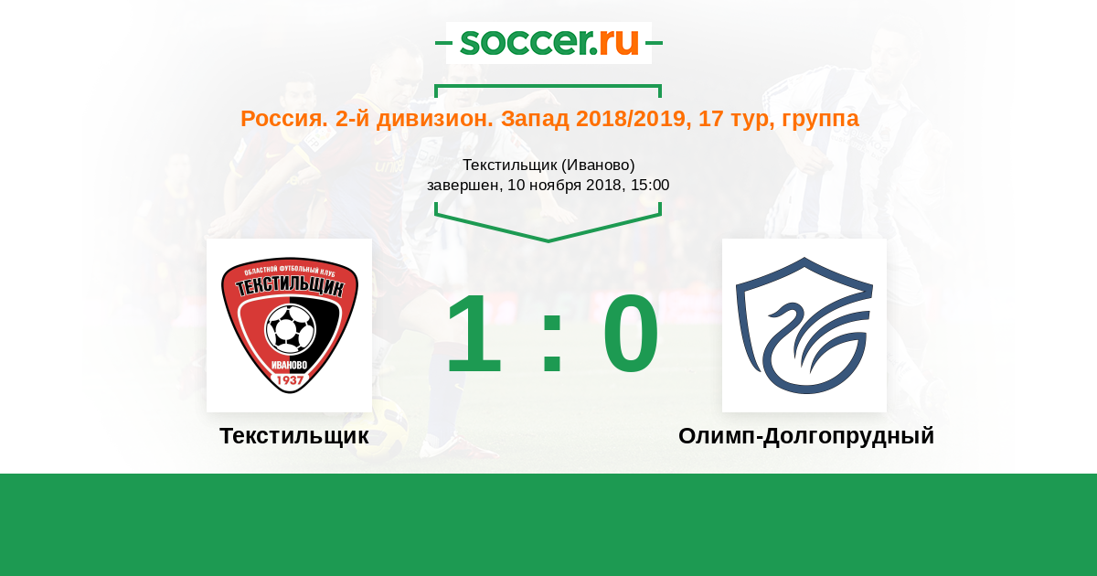 Россия. Вторая лига. Группа 2 17.08.2018 Долгопрудный Логотип футбольный клуб Долгопрудный 0:2 Логотип футбольный клуб Текстильщик (Иваново) Текстильщик