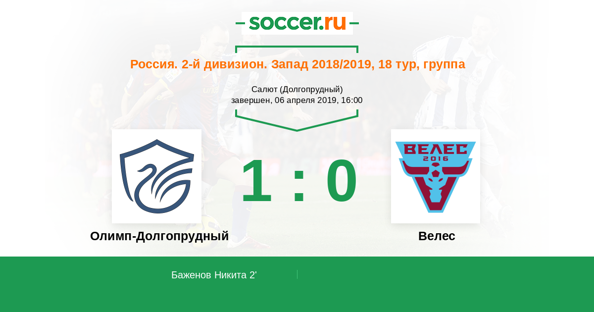Россия. Вторая лига. Группа 2 25.08.2018 Велес Логотип футбольный клуб Велес (Москва) 1:0 Логотип футбольный клуб Долгопрудный Долгопрудный