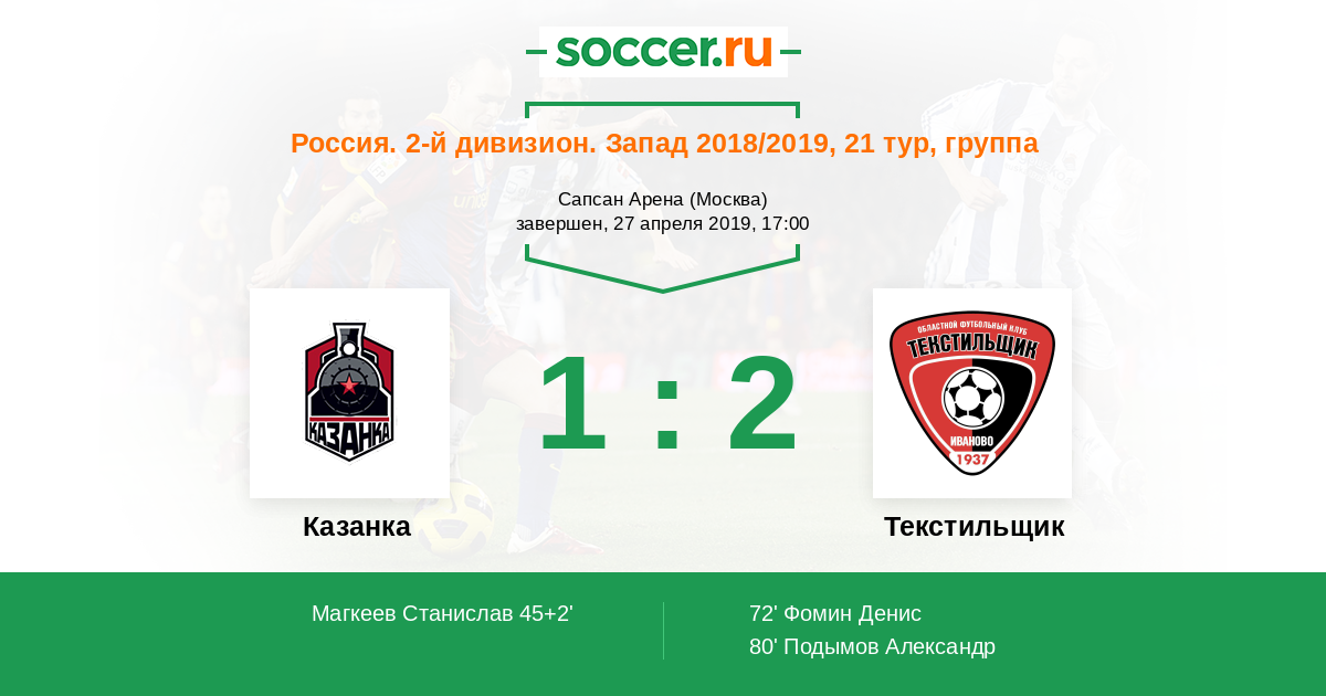 Россия. Вторая лига. Группа 2 21.04.2018 Текстильщик Логотип футбольный клуб Текстильщик (Иваново) 0:1 Логотип футбольный клуб Казанка (Москва) Казанка