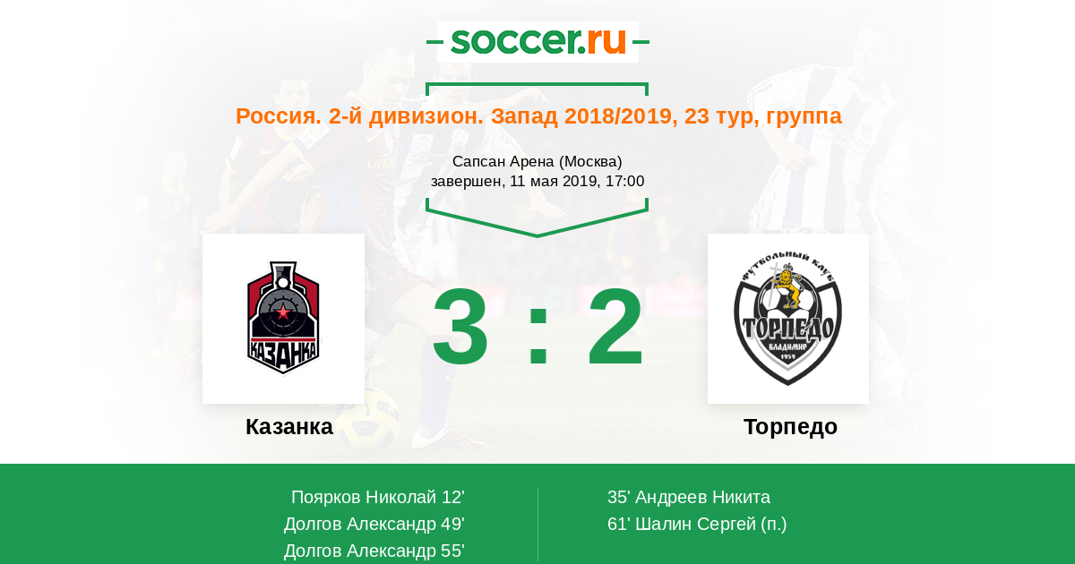 Россия. Вторая лига. Группа 2 03.08.2017 Торпедо Логотип футбольный клуб Торпедо (Владимир) 3:2 Логотип футбольный клуб Казанка (Москва) Казанка
