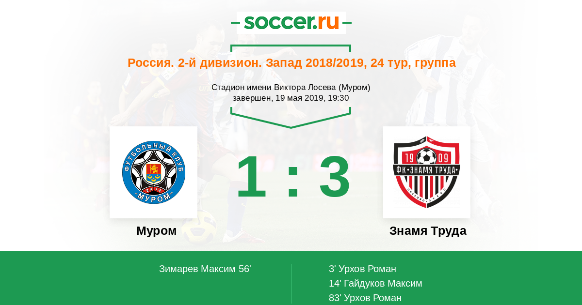 Россия. Вторая лига. Группа 2 06.09.2019 Знамя Труда Логотип футбольный клуб Знамя Труда (Орехово-Зуево) 2:2 Логотип футбольный клуб Муром Муром